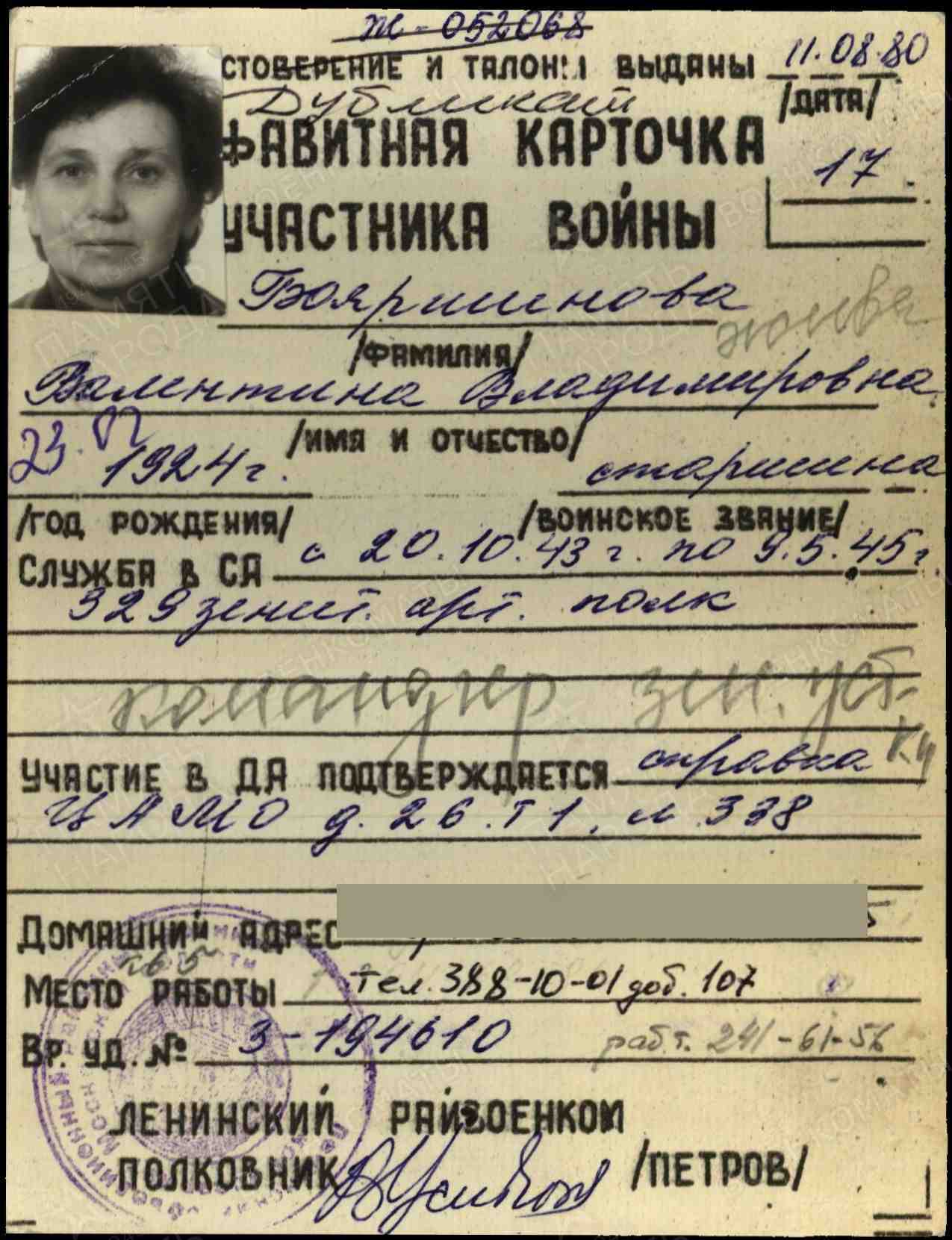 Валентина Владимировна вспоминала: «Я попала в 329-й зенитно-артиллерийский полк. Там прошла курсы радистов. Я служила заместителем, потом начальником радиостанции на 5 батарее, 145 дивизиона, 329 зенитно-артиллерийского полка, 1 корпуса ПВО. С 1943 года полк перешёл в состав 54 зенитно-артиллерийской дивизии. Мы жили в землянках, приходилось дежурить на вышке, проводить наблюдение за самолётами во время боевых тревог. В 1942 году были очень частые боевые тревоги. В обязанности входило также обеспечение связи с дивизионом. В 1945 году — заместитель начальника радиостанции на КП дивизиона. Там я встретила Победу в звании старшины.